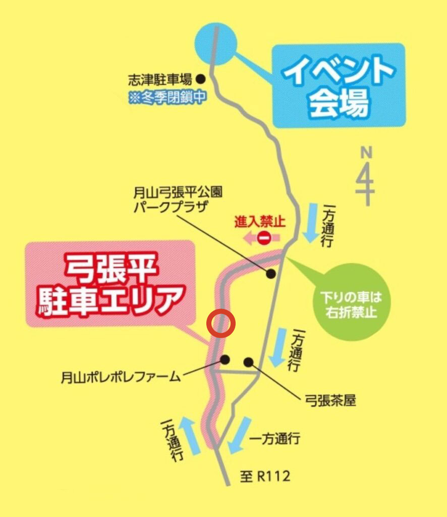路駐して大丈夫なのかと思われるかもですが、路駐指定なので路駐します。なにせ山中にある小さな温泉地なので駐車場のキャパシティが少なく、路駐せざるを得ないのでしょう。マイクロバスが巡回するので、ここからマイクロバスに乗って会場に行きます。