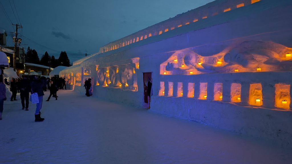 この「月山志津温泉 雪旅籠の灯り」には初日に参加出来たので真っ白な状態の雪旅籠や雪像を見ることが出来ました。時間が経つと溶けたり土の汚れが混じったりでもしかしたら、状態が悪くなってしまうかもしれません。